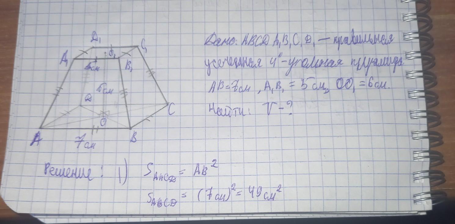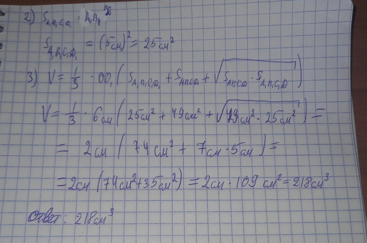 Вычисли объём правильной усечённой четырёхугольной пирамиды, если стороны