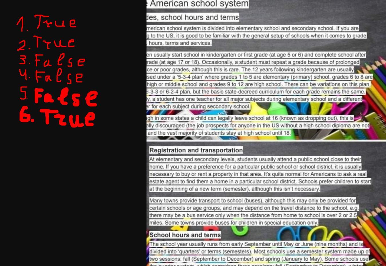 Choose True or False statements 1. The American school system is divided into elementary and secondary school . 2. Children usually start school in first grade at age . 3. Usually , a student has three teachers for all major subjects during elementary school . 4 . In some states a child can legally leave school at age 18 . 5.It is necessary for children to start at the beginning of a new term . 6 . The school year runs from September until May or June and is divided into quarters or terms . 7. The school day runs from 9 am to 4 pm . 8. Most elementary and secondary schools don't provide a self - service cafeter 9. Some children receive free lunches under local welfare programmes .