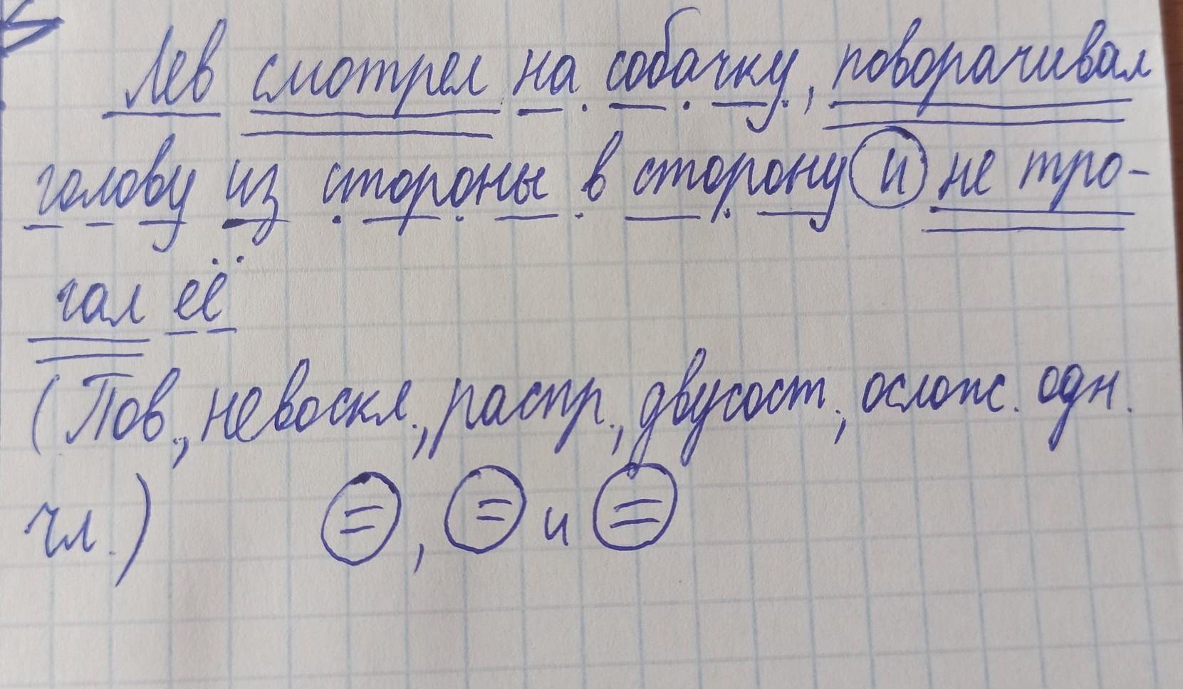 синтаксический разбор предложения Лев смотрел на собачку, поворачивал голову из стороны в сторону и не трогал её