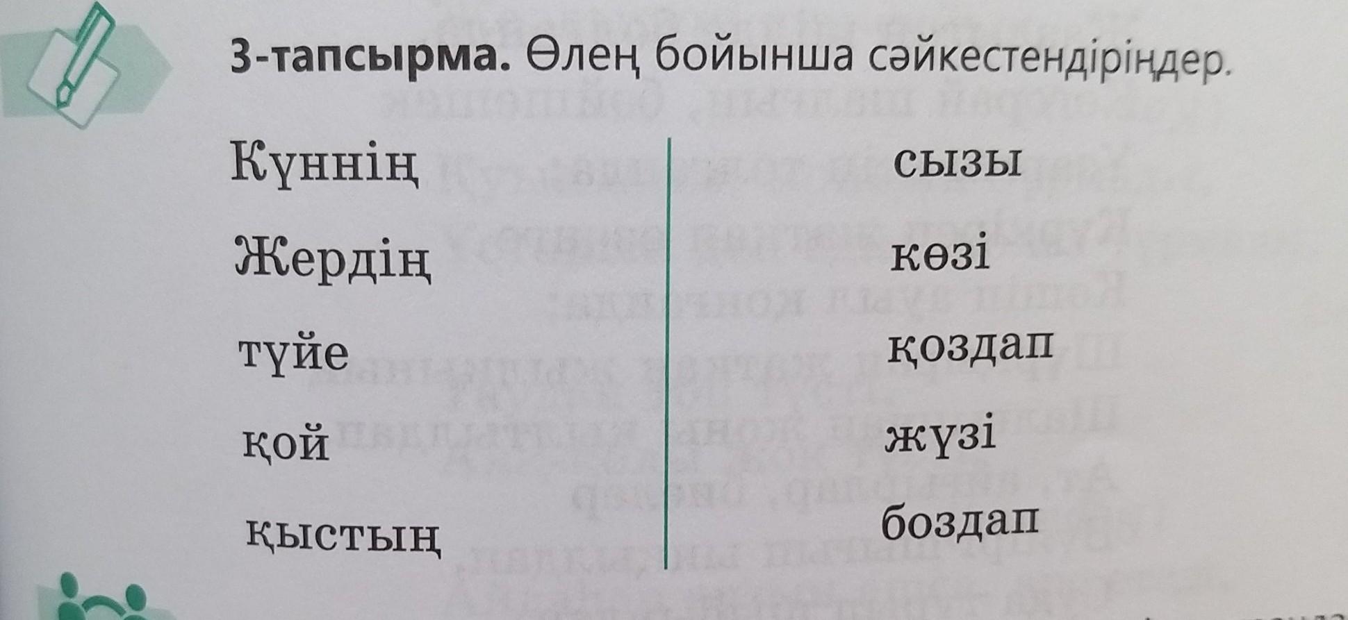 3-тапсырма. Өлең бойынша сәйкестендіріңдер. Сызы Күннің Жердің көзі түйе қоздап қой жүзі Қыстың боздап