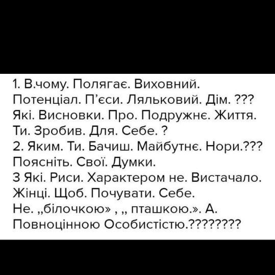 3)Мабуть, саме чоловік несе великий вплив на її, він сприймає її не як рівну собі особистість, а як іграшку-"жайворонка", "лялечку". А ще Нора не виховує дітей, а грає з ними, ніби продовжуючи гратися ляльками.
