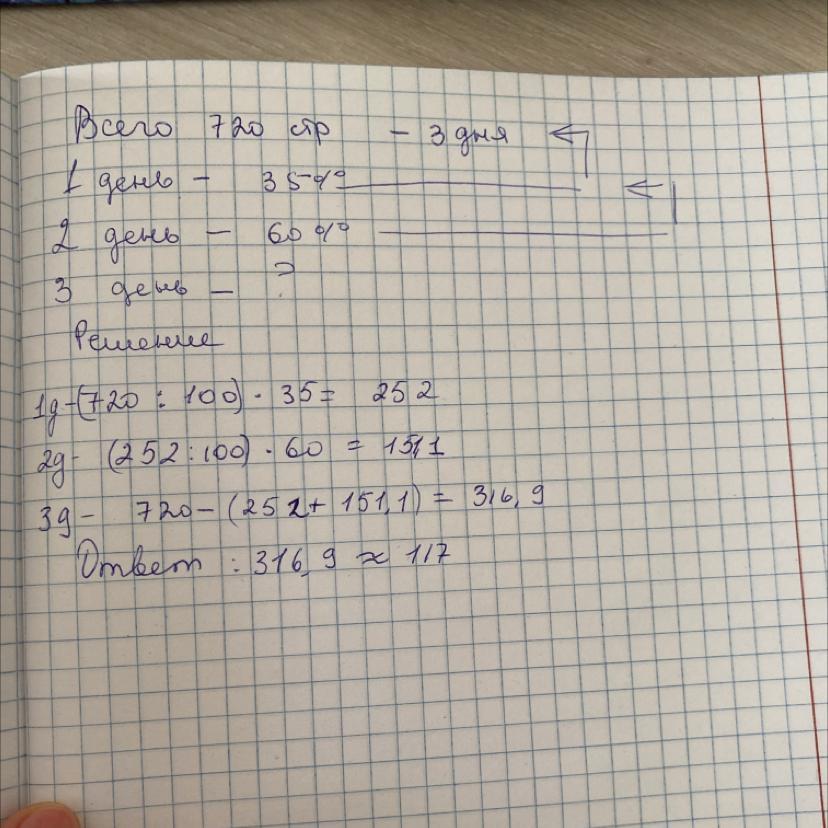 4. В книге 720 страниц. Коля прочитал книгу за 3 дня. В первый день Коля прочитал 35% всей книги и 60% от того, что он прочитал во второй день. Сколько страниц прочитал Коля в третий день?