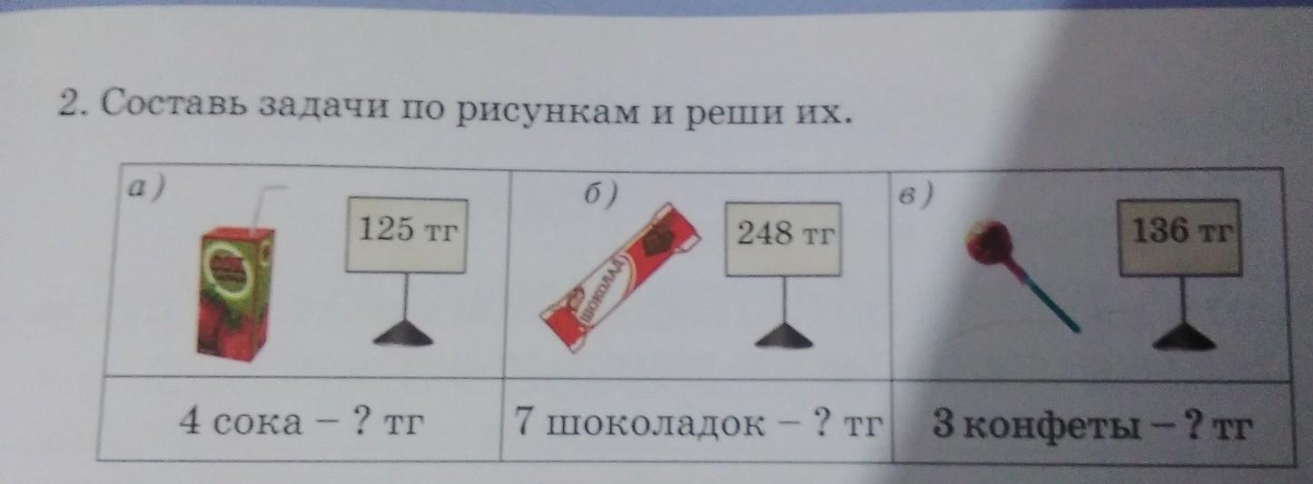 2. Составь задачи по рисункам и реши их. а) б) в) 125 тг 248 тг шокОЛАД) 4 сока - ? тг 7 шоколадок — ? тг 3 конфеты-?тг