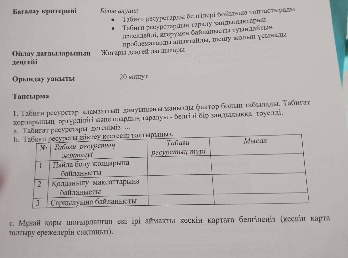 1.Табиғи ресурстың түрі:Литосфералық,Атмосфералық,Гидросфералық,Биосфералық ресурстар