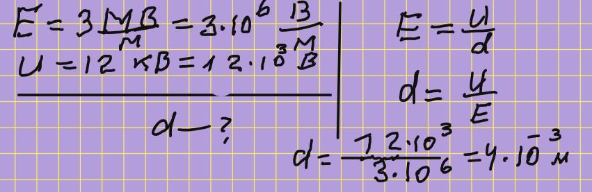 При якій відстані між пластинами плоского конденсатора настане пробій, якщо ударна йонізація повітря починається при напруженості поля 3 МВ/м? Напруга між пластинами конденсатора дорівнює 12 кВ. (Відповідь запишіть числом вираженим у мм)