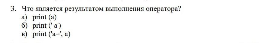 3. Что является результатом выполнения оператора? a) print (a) 6) print (^ prime a^ prime ) B) print (^ prime a=^ prime ,a)