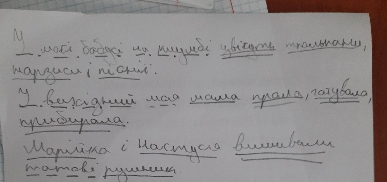У моєї бабусі на клумбі цвітуть тюльпани,нарциси і піонії. У вихідний моя мама прала ,готувала,прибирала. Марійка і Настусня вишивали татові рушник.