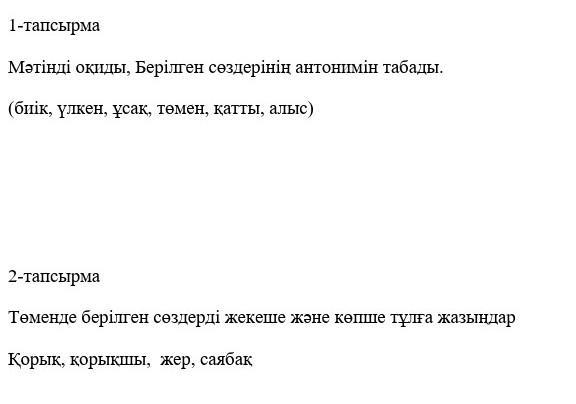 1-тапсырма Мәтінді оқиды, Берілген сөздерінің антонимін табады. (биік, үлкен, ұсақ, төмен, қатты, алыс) 2-тапсырма