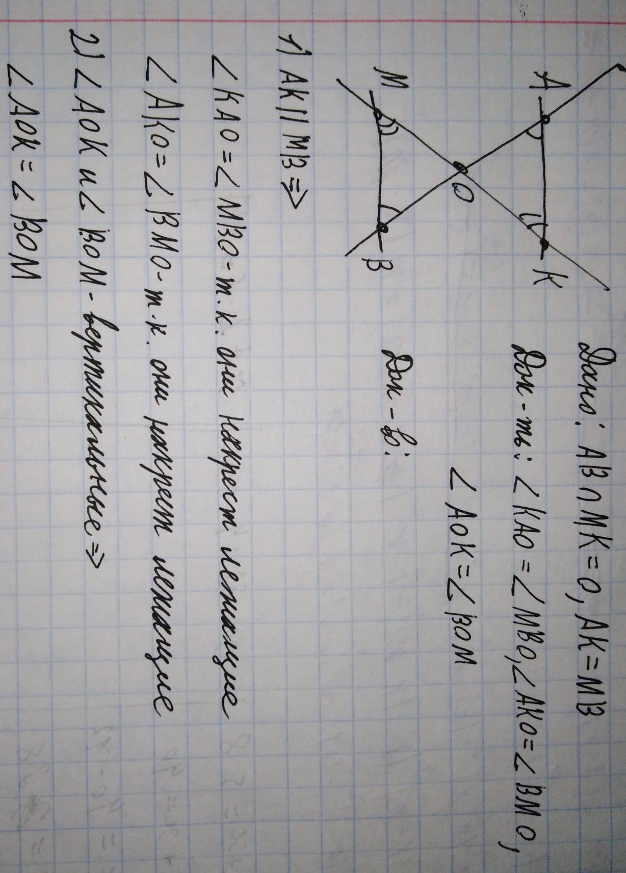Отрезки АВ и МК пересекаются в точке О причём прямые ВМ и АК паралельны Докажите что углы треугольника АОК равны углам треугольника ВОМ
