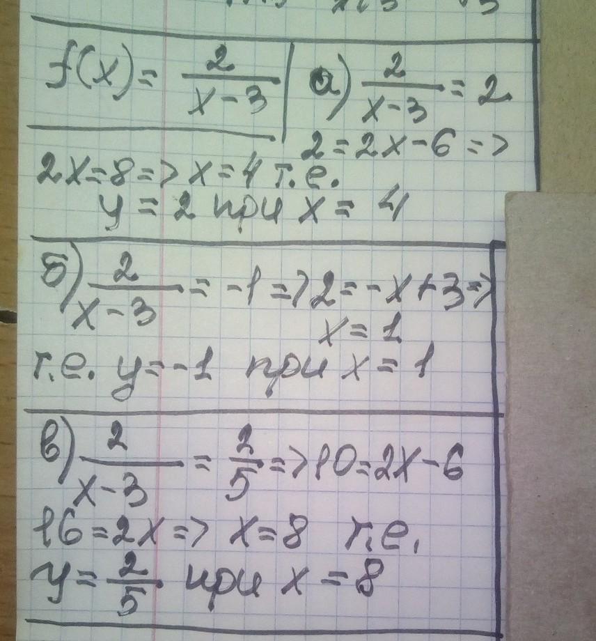 задано функцію f(x)=2/x-3 Визначте значення аргумента x для якого значення функції f(x) дорівнює а) 2 б)-1 в) 2/5