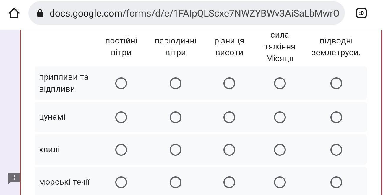 ДАЮ ВСІ БАЛИ СРОЧНО. Установіть відповідність між рухами води в Океані та чинниками що їх викликають. *