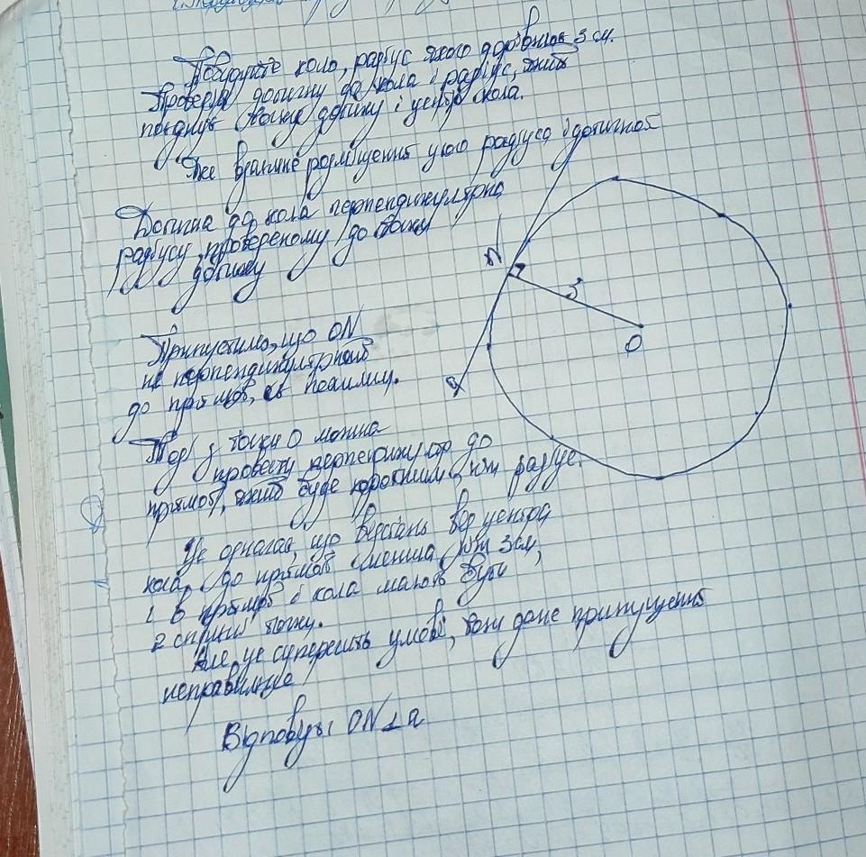 Побудуйте коло, радіус якого дорівнює 3 см. Проведіть дотичну до кола і радіус, який поєднує точку дотика і центр кола. Яке взаємне розміщення цього радіуса і дотичної? Дам 99 балов