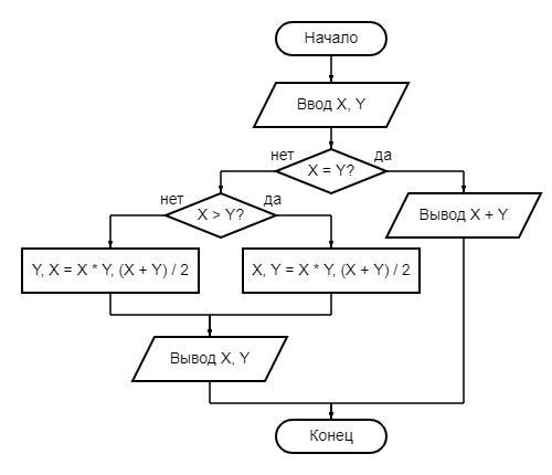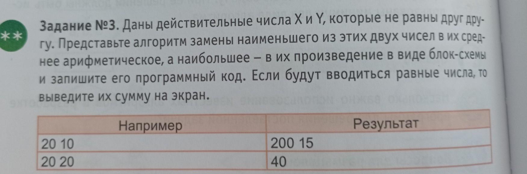Задание №3. Даны действительные числа ХиҮ, которые не равны друг дру- гу. Представьте алгоритм замены наименьшего из этих двух чисел в их сред- нее арифметическое, а наибольшее – в их произведение в виде блок-схемы и запишите его программный код. Если будут вводиться равные числа, то выведите их сумму на экран. Например Результат 20 10 20 20 200 15 40