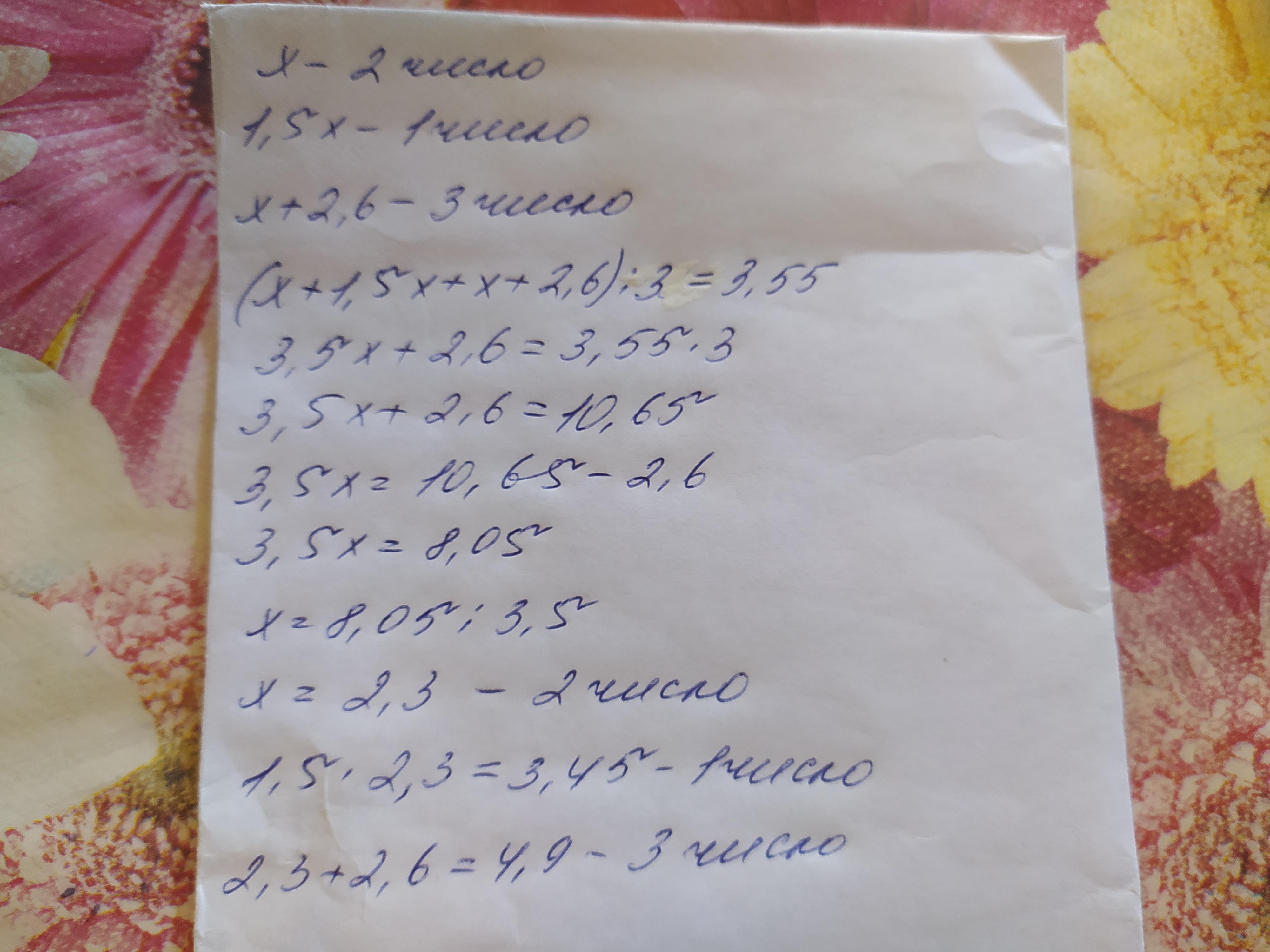 Помогите пожалуйста Среднее арифметическое трех чисел 3,55. Превое число в 1,5 раза больше второго, а третье на 2,6 больше второго числа. Найдите эти числа.Спомощью уравнения.