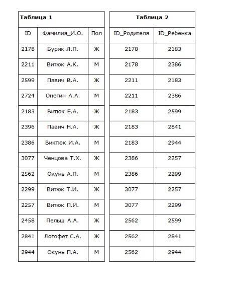 Смотрим на ID родителя Павич В.А. - 2211, в базе это Витюк А. К., смотрим на ID ребёнка Витюк А. К - это 2386 - Витюк И. А