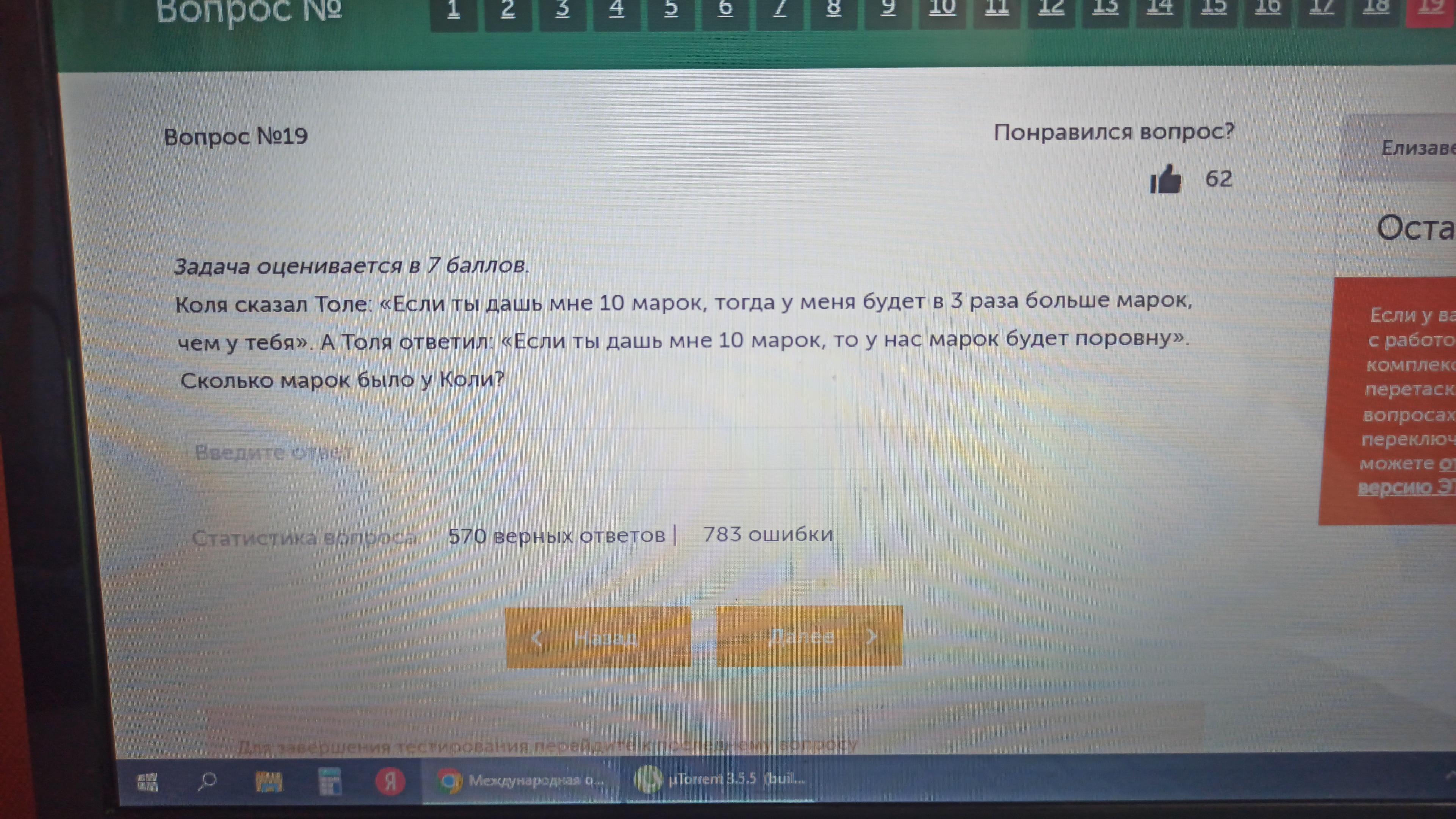 У Коли было 30 марок потому что если бы он дал Толе 10 марок То у обоих бы было 20