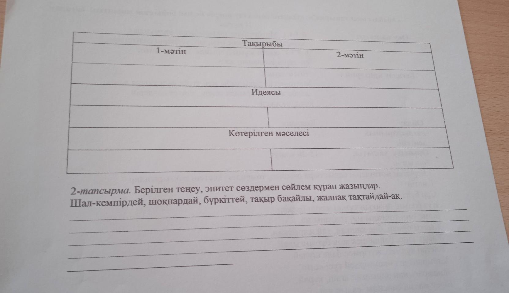 2-тапсырма. Берілген теңеу, эпитет сөздермен сөйлем құрап жазыңдар. Шал-кемпірдей, шоқпардай, бүркіттей, тақыр бақайлы, жалпақ тақтайдай-ан