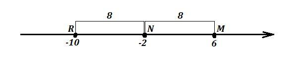 Точка М(6) находится на расстоянии 8 единиц от точки N(-2) , так как 6-(-2)=8 , тогда и точка R должна находиться на расстоянии 8 единиц от точки N , только с противоположной стороны. Значит координата точки R равна -2-8= -10 .