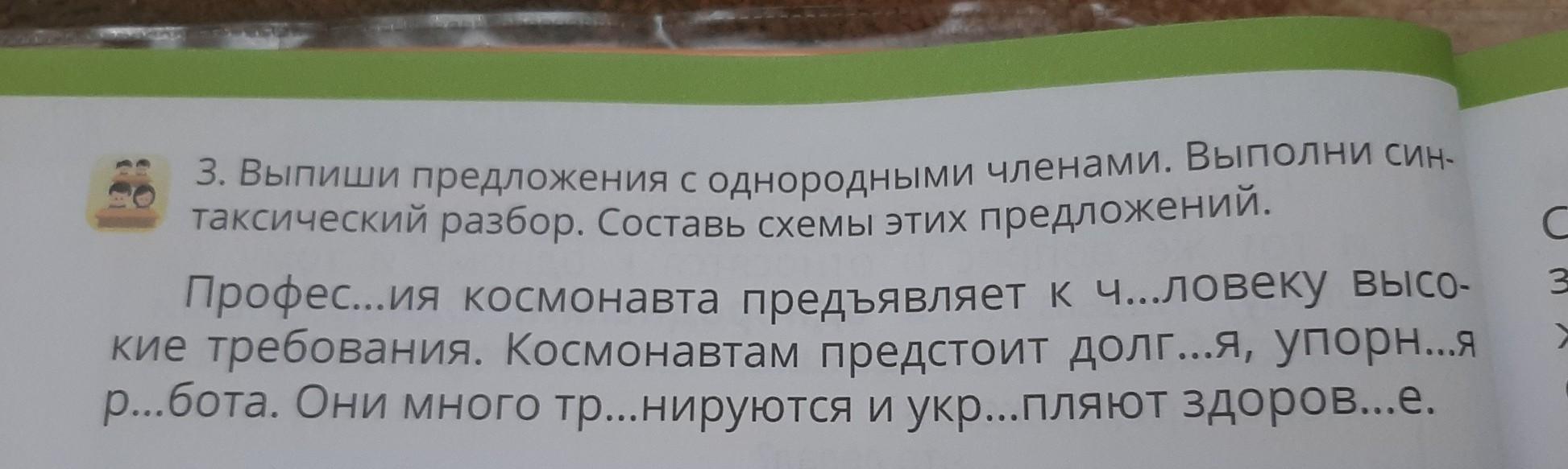 3. Выпиши предложения с однородными членаме таксический разбор. Составь схемы этих предложен Профес...ия космонавта предъявляет кч. кие требования. Космонавтам предстоит доля р...бота. Они много тр...нируются и укр...пляют