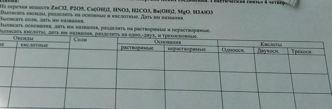 Задання: 1. Из перечня веществ ZnCl2, P2O5, Cu(OH)2, HNO3, H2CO3, Ba(OH)2, MgO, H3AO3 А) Вынсать оксеты, разделить на основные н кислотные. Дать им названия. Б) Выписать соуин, дать IN Hвая. В) Выписать основання, дать им названия, разделить на растворимые и нерастворимые. Г) Вышсать кислоты. Дать Hм названия, радделігть ні одно, -Двух, и трех основныс. Оксиды Солн Основания KHQIOTHNIC растворимые нерастворимые Кисл Двухо OCHOBRNO Одноосн.