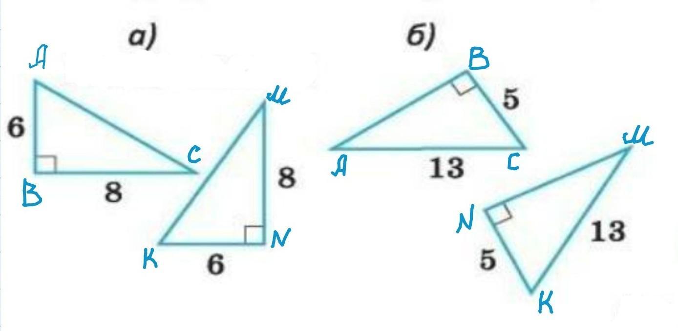 б) AC=MK=13 ед, BC=NK=5ед. Так как гипотенуза AC равна гипотенузе MK, а катет BC равен катету KN, то △ABC =△MNK по гипотенузе и катету.