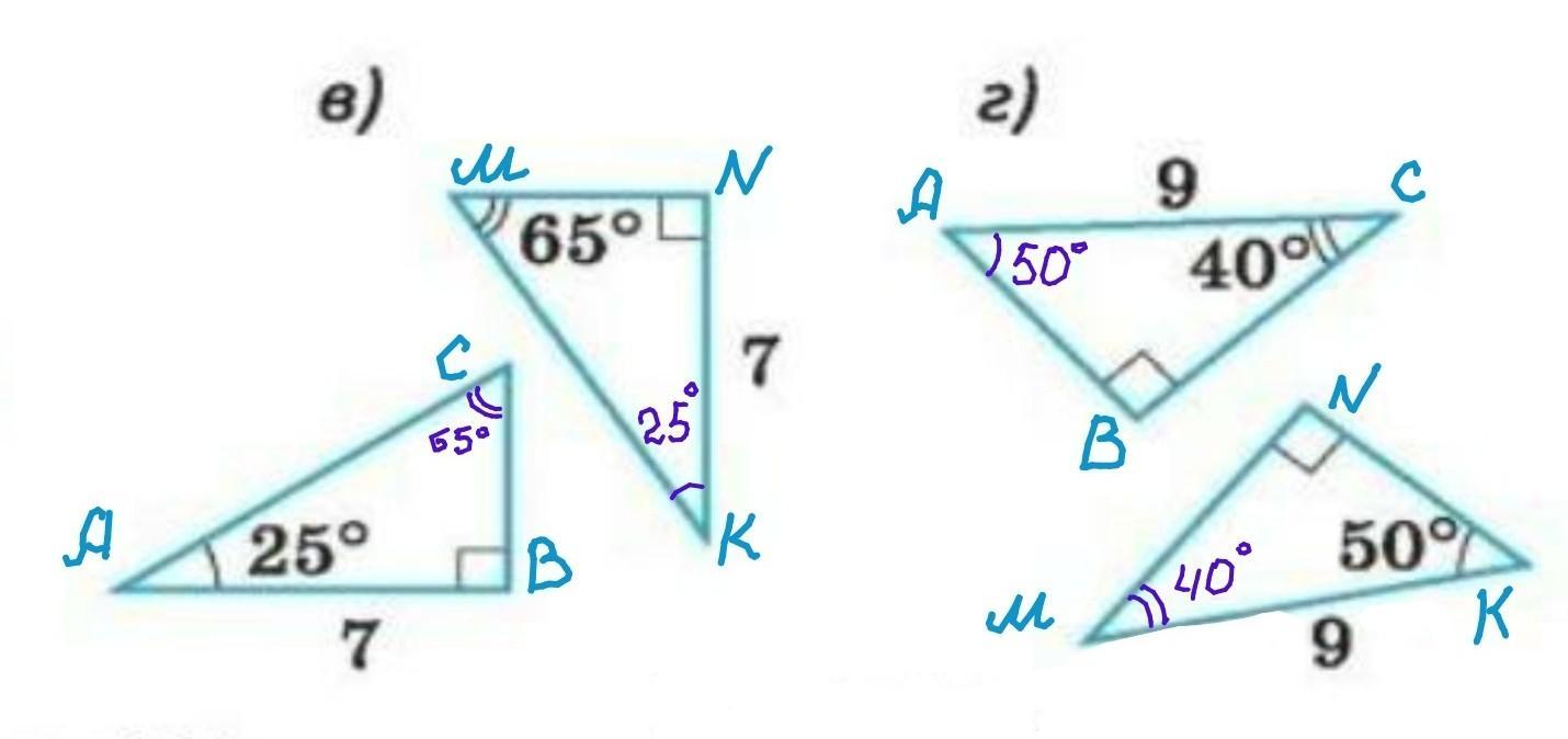 в) Сумма острых углов в прямоугольном треугольнике равна 90°. ∠K=90°-∠M=90°-65°=25°.