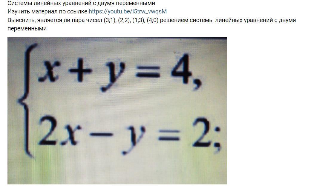 Выяснить, является ли пара чисел (3;1), (2;2), (1;3), (4;0) решением системы линейных уравнений с двумя переменными