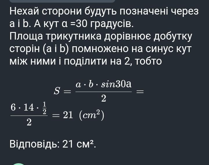 Знайти площу трикутника у якого дві сторони дорівнюють 12см і 15см, а кут між ними 45 градусів