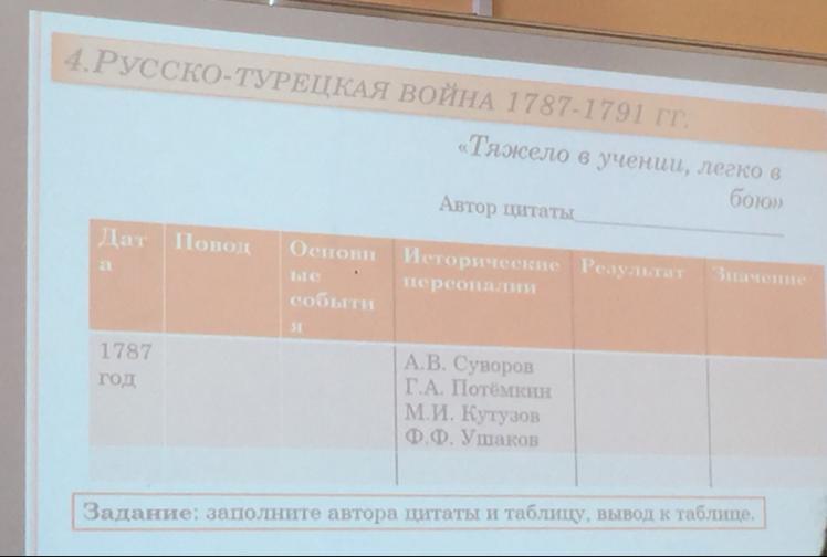 Причины:После первой русско-турецкой войны России отошла значительная часть земель, находившаяся ранее под влиянием Порты. Османская империя желала вернуть их под свой протекторат, что стало причиной войны 1787-1791 гг. Основные сражения: Победы. Поражения 1787г – разгром турецкого десанта у крепости Кинбурн. 1788г. – взятие крепости Очаков. 1789г. - победа над турками на р. Рымник, взятие. Фокшан 1790г. - взятие крепости Измаил. А.В. Суворов, Г.А. Потемкин 1791г.-морское сражение у мыса Калиакрия. Керченское сражение, сражение у о.Тендра.Ф.Ф. Ушаков 1791 - победа в. Мачинском сражении - последнем крупном сражении в данной войне. Результат: Победа России Ясский мирный договор. Автор цитаты Тяжело в учении, легко в бою- Александр Суворов. Если нужно значение то вот оно: Тяжело в учении, легко в бою значит что когда ты в первый раз начинаешь заниматься этим, тебе тяжело но когда становишься опытным то тебе уже легко
