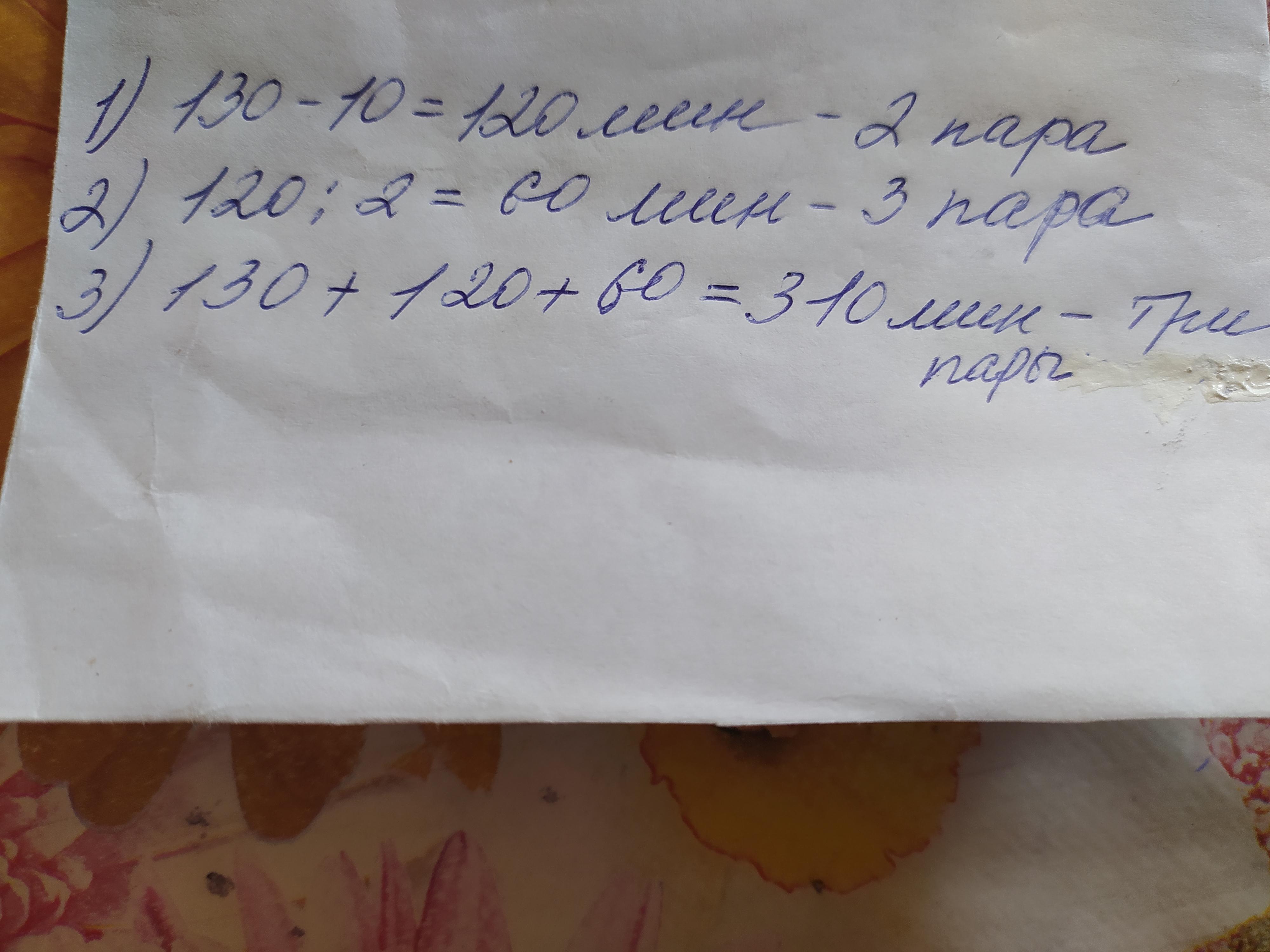 Помогите решить задачю1 пара сыграла за 130 мин,2 пара на 10 мин меньше чем1 а 3 в 2 раза меньше чем 2 пара.скольк мин играла 3 пара?