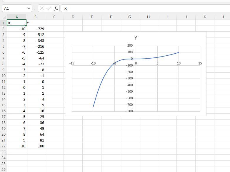 - Столбец X заполняем от -10 до 10 с интервалом 1. В ячейку А2 пишем -10, в ячейку А3 пишем формулу: =A2 + 1. Протягиваем формулу к ячейке А22.