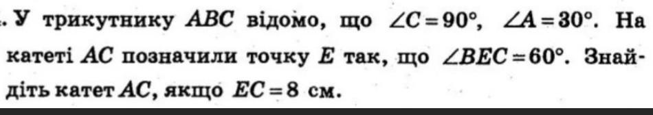 {\rm tg}\,60^\circ =\dfrac{BC}{EC}~~\Rightarrow~~ BC=EC\cdot {\rm tg}\, 60^\circ=8\sqrt{3}tg60