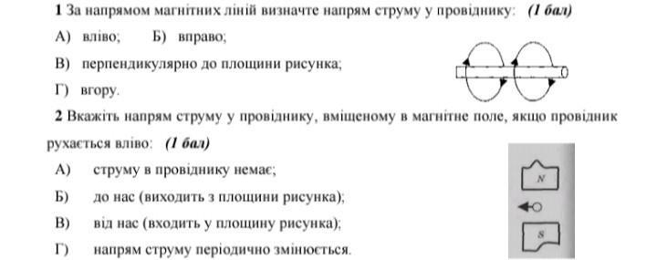 1. За напрямом магнітних лiнiй визначте напрям струму у провіднику: