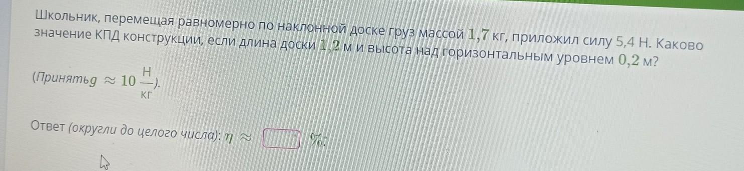 η=Ап/Аз=mgh/Fl=1,7*10*0,2/5,4*1,2=0,525*100%=52,5%