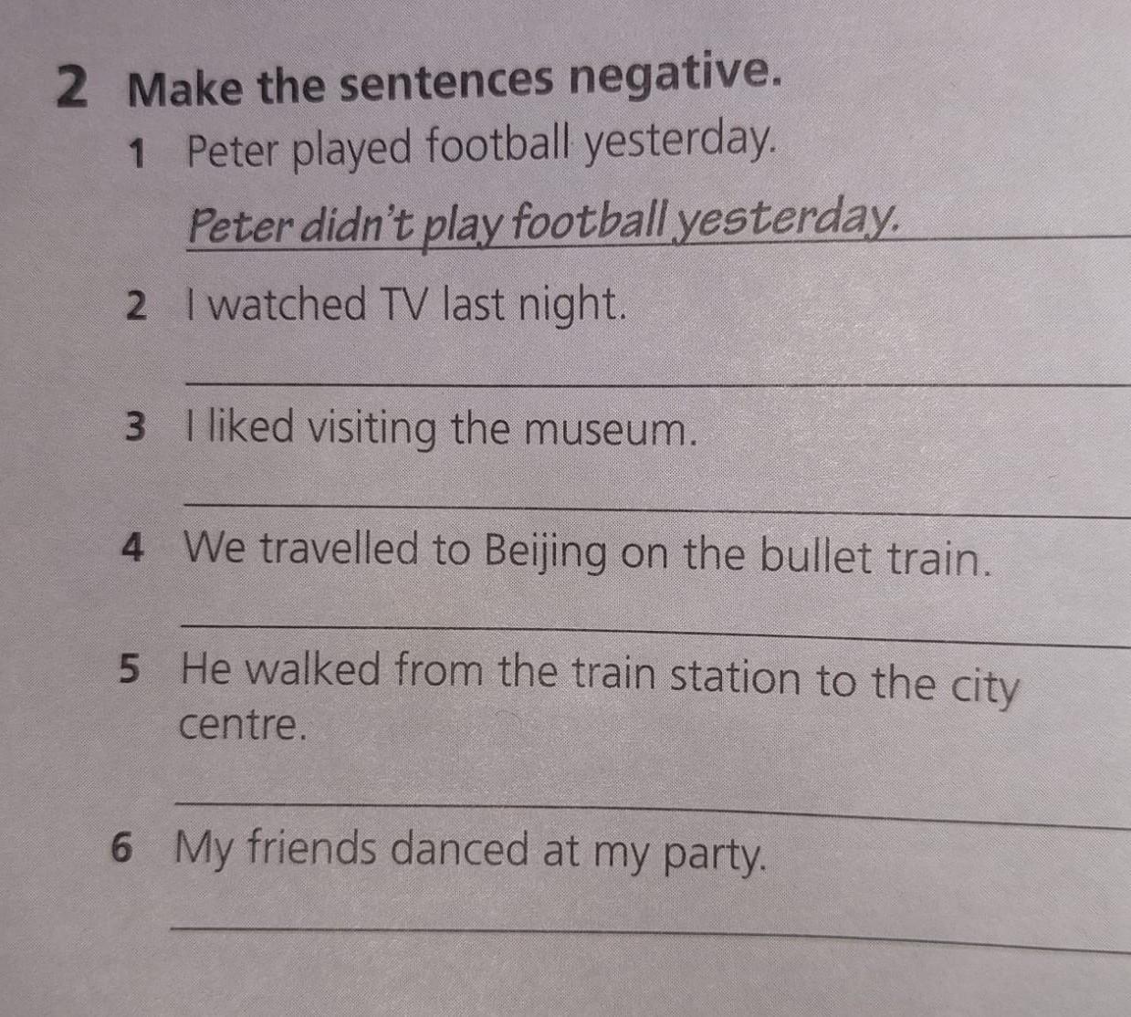 2 Make the sentences negative. 1 Peter played football yesterday. Peter didn't play football yesterday. 2 I watched TV last night. 3 I liked visiting the museum. 4 We travelled to Beijing on the bullet train. 5 He walked from the train station to the city centre. 6 My friends danced at my party.