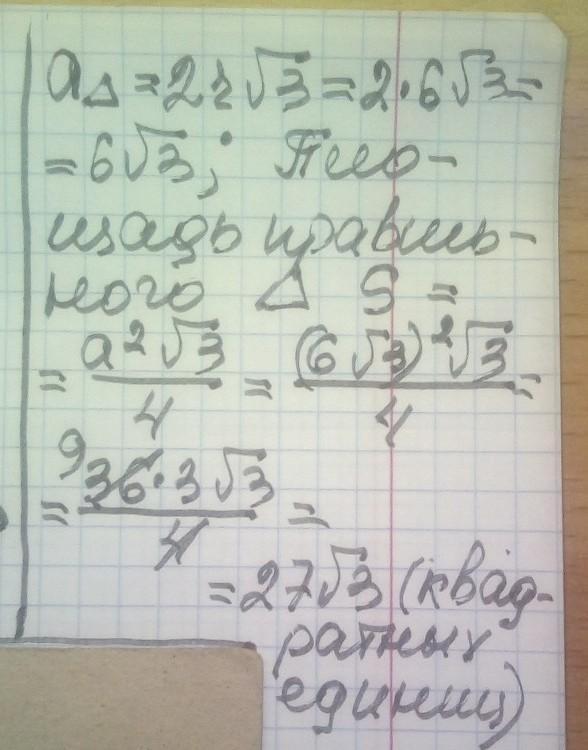 r=а/(2√3)⇒а=6*2√3=12√3, площадь треугольника может быть найдена по формуле а²√3/4=(12√3)²*√3/4=144*3√3/4=108√3