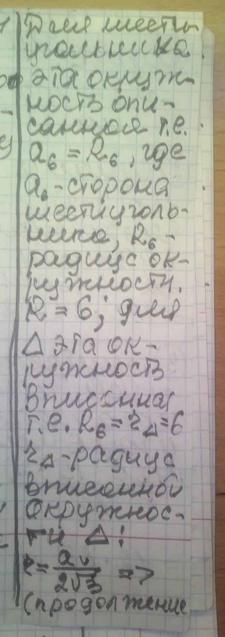 радиус окружности, описанной около правильного шестиугольника, равен стороне шестиугольника, т.е. 6, он же является радиусом окружности, вписанной в правильный треугольник со стороной а.