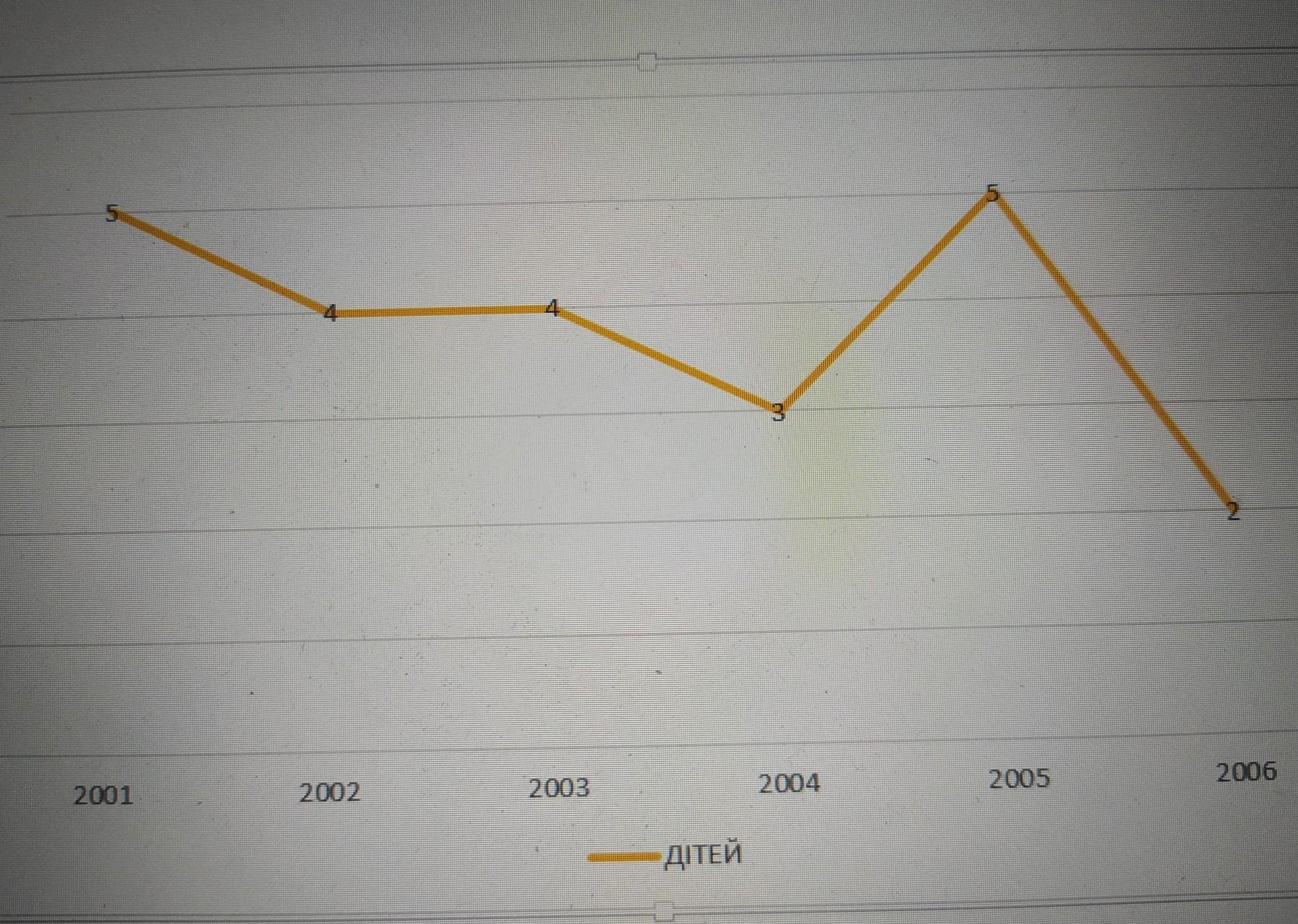 У танцювальному колективі 5 дітей 2001 року народження 4—2002,4—2003,3—2004,5-2005,2-2006. Подайте ці дані у вигляді : діаграми графіка