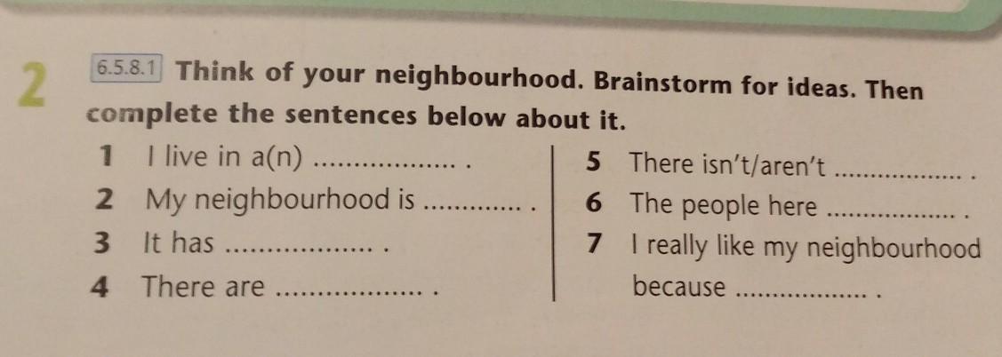 2 6.5.8.1 Think of your neighbourhood. Brainstorm for ideas. Then complete the sentences below about it. 1 I live in a(n) ... 5 There isn't/aren't ..... 2 My neighbourhood is ......... 6 The people here ..... 3 It has ... 7 I really like my neighbourhood 4. There are because bourhood)