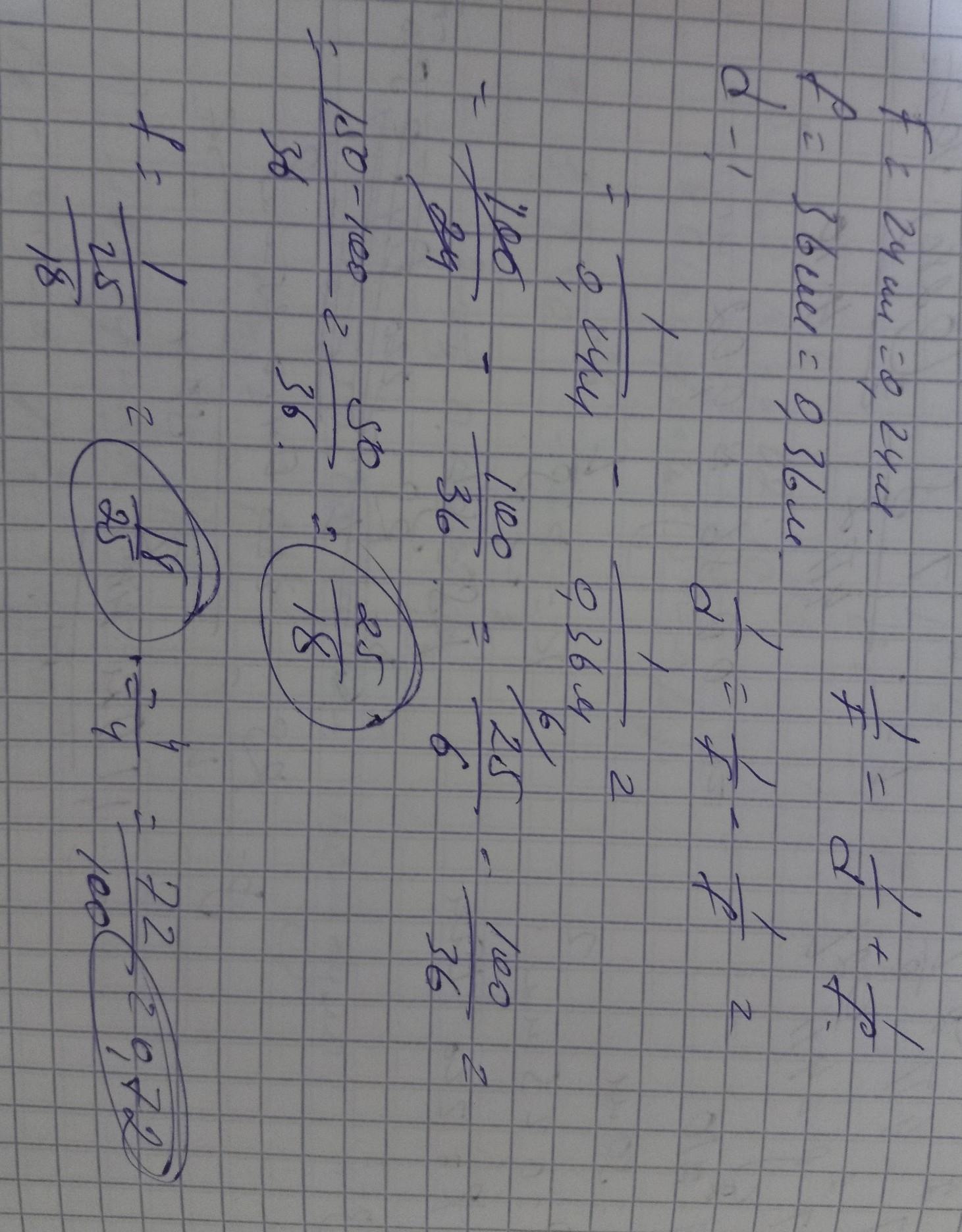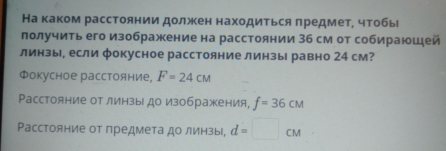 На каком расстоянии должен находиться предмет, чтобы получить его изображение на расстоянии 36 см от собирающей линзы, если фокусное расстояние линзы равно 24 см? Фокусное расстояние, F = 24 см Расстояние от линзы до изображения, f= 36 см Расстояние от предмета до линзы, d=..см