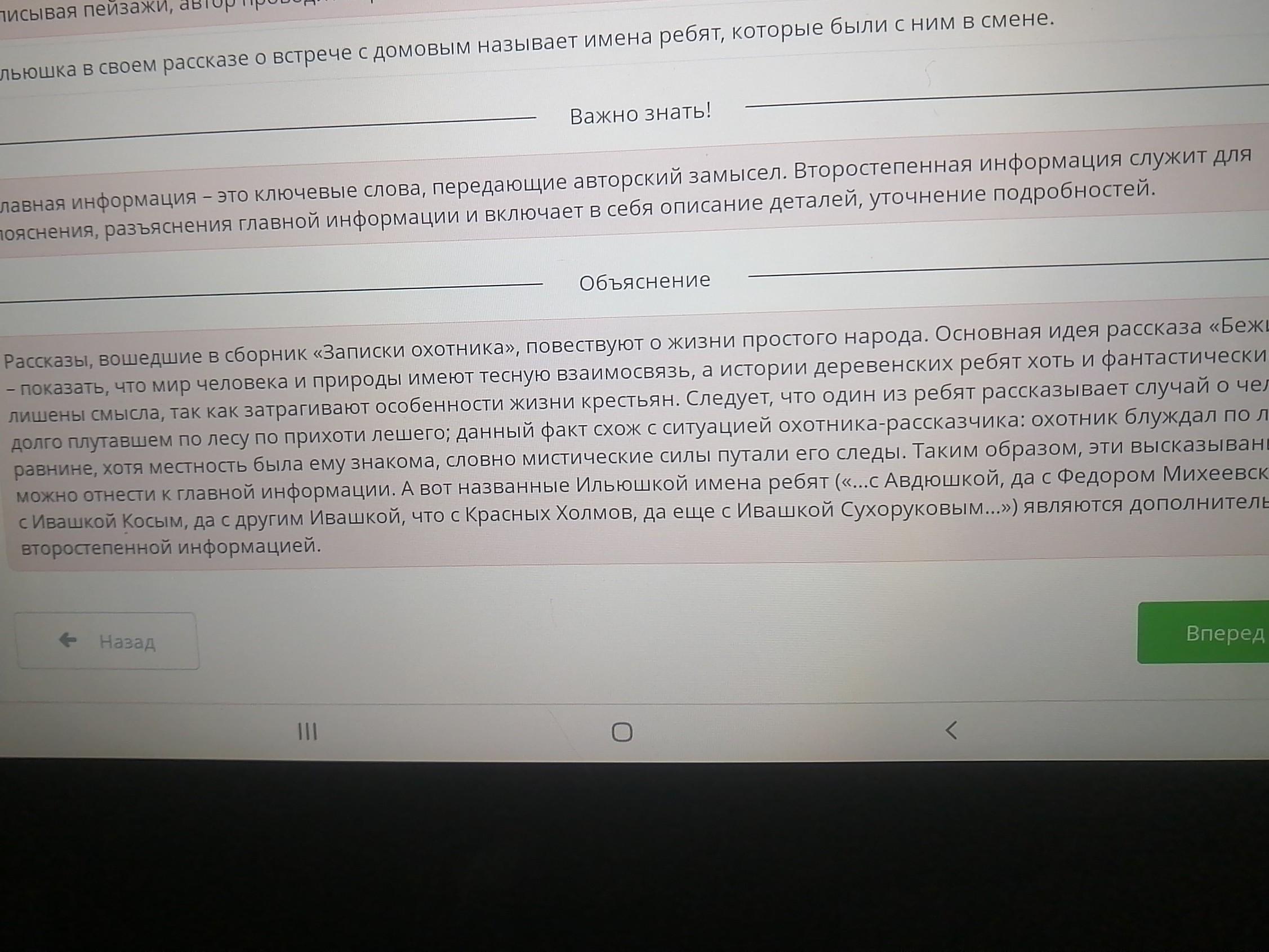 Что из перечисленного является второстепенной информацией рассказа «Бежин луг»? Ильюшка в своем рассказе о встрече с домовым называет имена ребят, которые были с ним в смене. Один из ребят рассказывает случай о человеке, долго плутавшем по лесу по прихоти лешего; данный факт схож с ситуацией охотника-рассказчика. Истории деревенских ребят хоть и фантастические, но не лишены смысла, так как затрагивают особенности жизни крестьян. Описывая пейзажи, автор проводит параллель между человеком и Миром природы.
