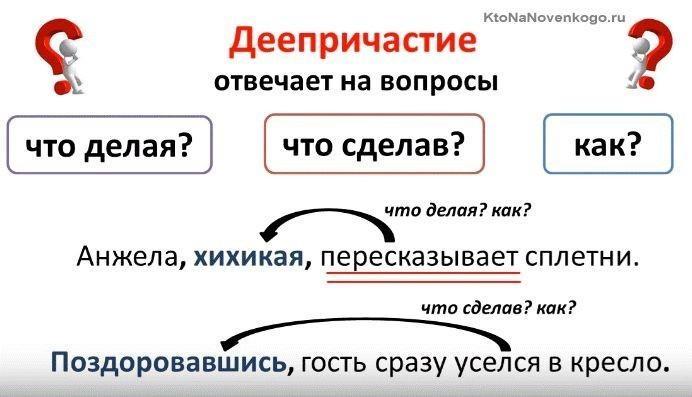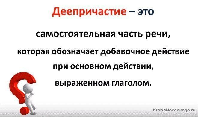 Дееприча́стие — особая форма глагола или самостоятельная часть речи (спорно) в русском языке, обозначающая добавочное действие при основном. Соединяет в себе признаки глагола (вид, залог, переходность и возвратность) и наречия (неизменяемость, синтаксическая роль обстоятельства).
