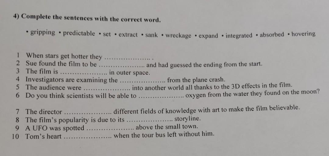 4) Complete the sentences with the correct word. * gripping predictable • set extract siank • wreckage gxpand integrated absorhed • hovering