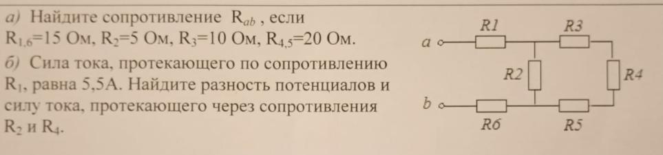 R1=R6=15 Ом R2=5 Ом R3=10 Ом R4=R5=20 Ом I1=5.5 A Rab=? U2=? I2=? U4=? I4=?