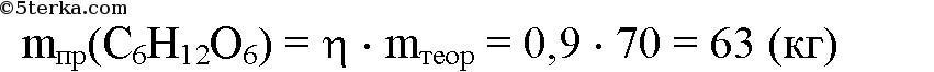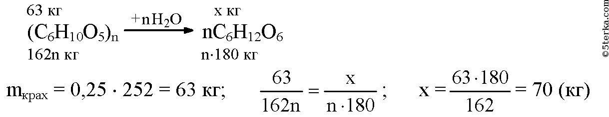 Рассчитайте массу глюкозы, которая получается из картофеля массой 252 кг, в котором массовая доля крахмала составляет 25%, если массовая доля выхода глюкозы составляет 90%. (Ответ: 63 кг.)