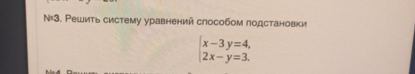 \displaystyle \left \{ {{x-3y=4} \atop {2x-y=3}} \right.\\ \\\left \{ {{x=4+3y} \atop {2x-y=3}} \right.\\ \\2(4+3y)-y=3\\y=-1\\x=4+3*(-1)\\x=1\\(x,y)=(1,-1)