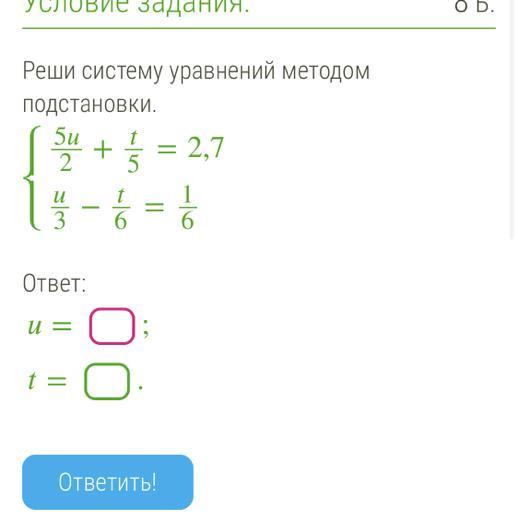 \displaystyle \left \{ {\frac{5u}{2}+\frac{t}{5}=2,7  } \atop {\frac{u}{3}-\frac{t}{6}=\frac{1}{6}   }} \right.\\ \\\left \{ {{\frac{5u}{2}+\frac{t}5}=2,7  } \atop {u=\frac{1}{2}+\frac{1}{2}t  }} \right. \\\\\frac{5(\frac{1}{2}+\frac{1}{2}t)  }{2}+\frac{t}{5}=2,7\\ \\t=1\\ \\u=\frac{1}{2}+\frac{1}{2}*1\\ \\u=1\\ (t,u)=(1,1)