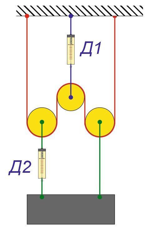 Пусть груз 10 Н. Тогда натяжение Д2 будет 5 Н. Две нити вверх дают по 2,5 Н и у Д1 две нити по 2,5 Н дают 5 Н,