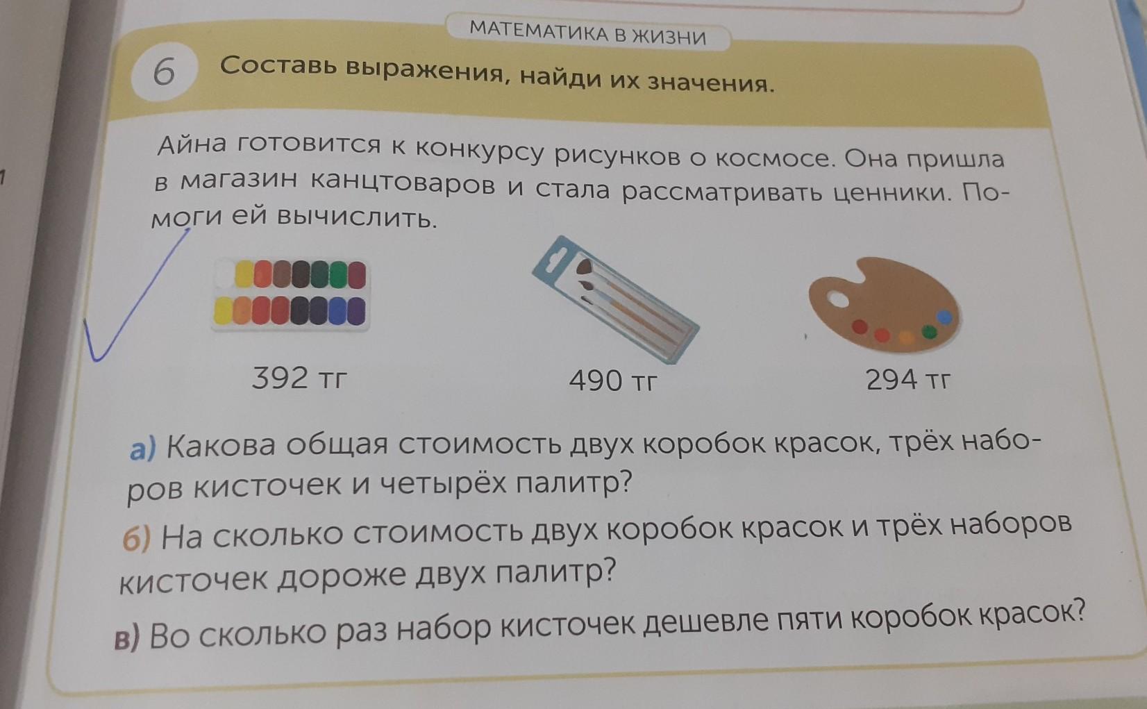 МАТЕМАТИКА В ЖИЗНИ 6 Составь выражения, найди их значения. Айна готовится к конкурсу рисунков О космосе. Она пришла в магазин канцтоваров и стала рассматривать ценники. По- моги ей вычислить. 000000 0000 392 тг 490 тг 294 тг а) Какова общая стоимость двух коробок красок, трёх набо- ров кисточек и четырёх палитр? 6) На сколько стоимость двух коробок красок и трёх наборов Кисточек дороже двух палитр? в) Во сколько раз набор кисточек дешевле пяти коробок красок?Пж срочно нужно дам 30 баллов с краткой записью или с условьем