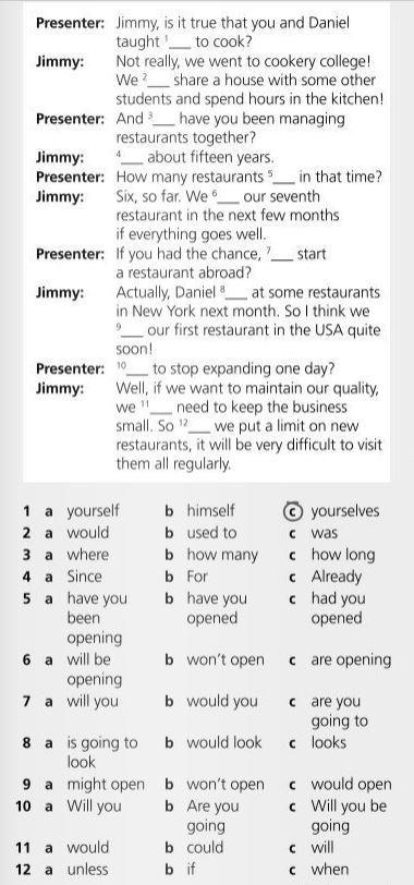 6 5 Circle the correct options. Jimmy: We Jimmy: Jimmy: Presenter: Jimmy, is it true that you and Daniel taught'__ to cook? Not really, we went to cookery college! share a house with some other students and spend hours in the kitchen! Presenter: And' have you been managing restaurants together? 4_about fifteen years. Presenter: How many restaurants in that time? Six, so far. We our seventh restaurant in the next few months if everything goes well Presenter: If you had the chance, start a restaurant abroad? Jimmy: Actually, Daniel at some restaurants in New York next month. So I think we our first restaurant in the USA quite soon! Presenter: 10 to stop expanding one day? Jimmy: Well, if we want to maintain our quality, we 11 need to keep the business small. So 12 we put a limit on new restaurants, it will be very difficult to visit them all regularly. 9 S 7 1 a yourself 2 a would 3 a where 4 a Since 5 a have you been opening 6 a will be opening 7 a will you b himself bused to b how many b For b have you opened yourselves C was c how long c Already chad you opened b won't open care opening b would you care you going to clooks b would look 8 a is going to look 9 a might open 10 a Will you b won't open b Are you C would open c Will you be going C will C when Total: 11 going b could bif 11 a would 12 a unless